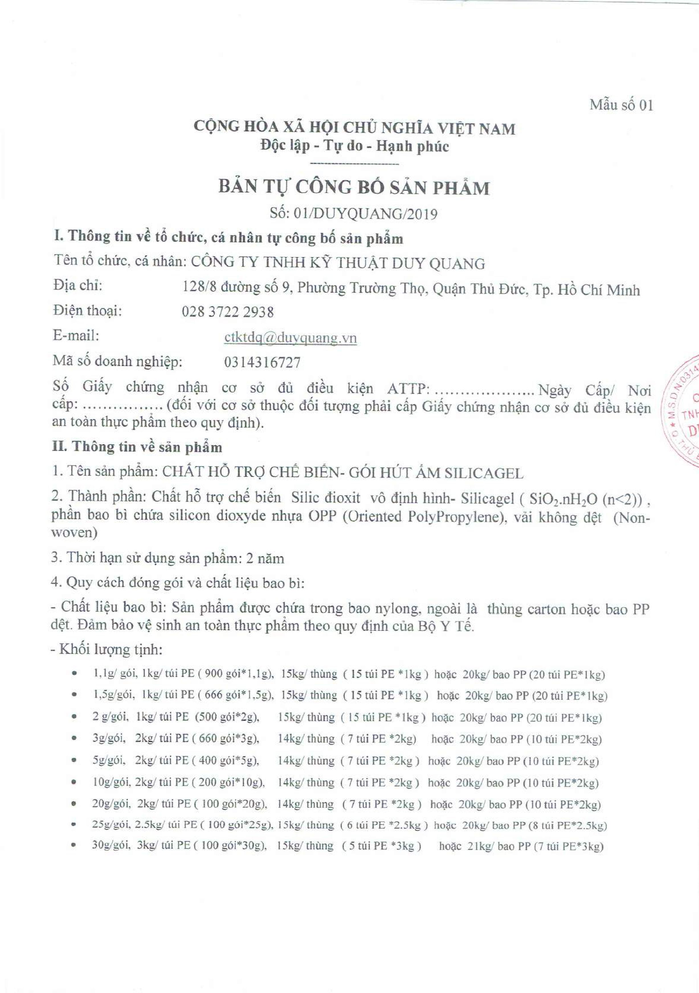 TỰ CÔNG BỐ HẠT CHỐNG ẨM SILICAGEL/ TÚI CHỐNG ẨM SILICAGEL